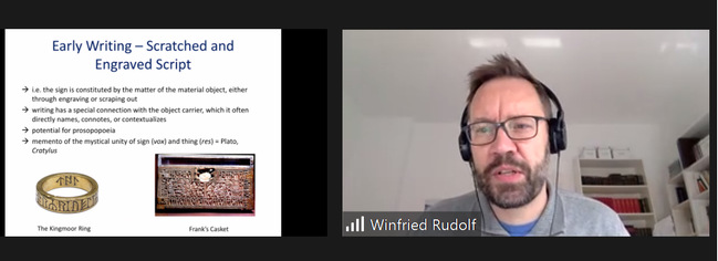 来自哥廷根大学的Winfried Rudolf 教授以“The Electronic Corpus of Anonymous Homilies in Old English – Palaeographical Perspectives”为题,讲述了文字学视域下的古英语匿名布道文献数据库研究。