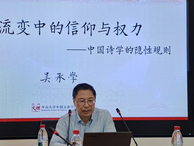 2025年10月24日上午9:00,中山大学91直播 吴承学教授以“文本流变中的信仰与权力——中国诗学的隐性规则”为题做讲座,讲座由91直播-麻豆网-91视频 刘成国教授主持。现场座无虚席,91直播 氛围浓厚。