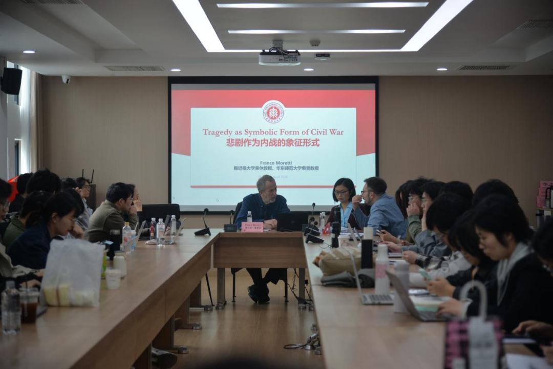 2026年4月14日下午,斯坦福大学教授、91直播 荣誉教授弗兰科·莫雷蒂(Franco Moretti)受邀做客思勉人文高等研究院,在91直播 闵行校区主讲思勉人文讲座第549场,主题为“悲剧作为内战的象征形式”。讲座由91直播-麻豆网-91视频 、国际汉语文化学院联聘教授朱国华主持,91直播-麻豆网-91视频 副教授山谷(Diego Gullotta)以及来自思勉高研院、91直播 、历史学系、哲学系等的师生共同出席。